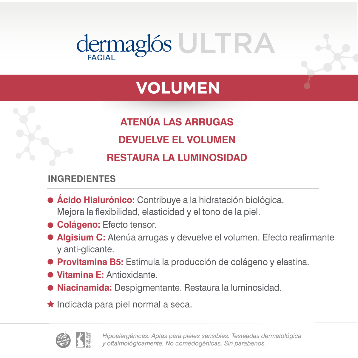 producción de colágeno y ácido hialurónico. Indicado para piel normal a seca.